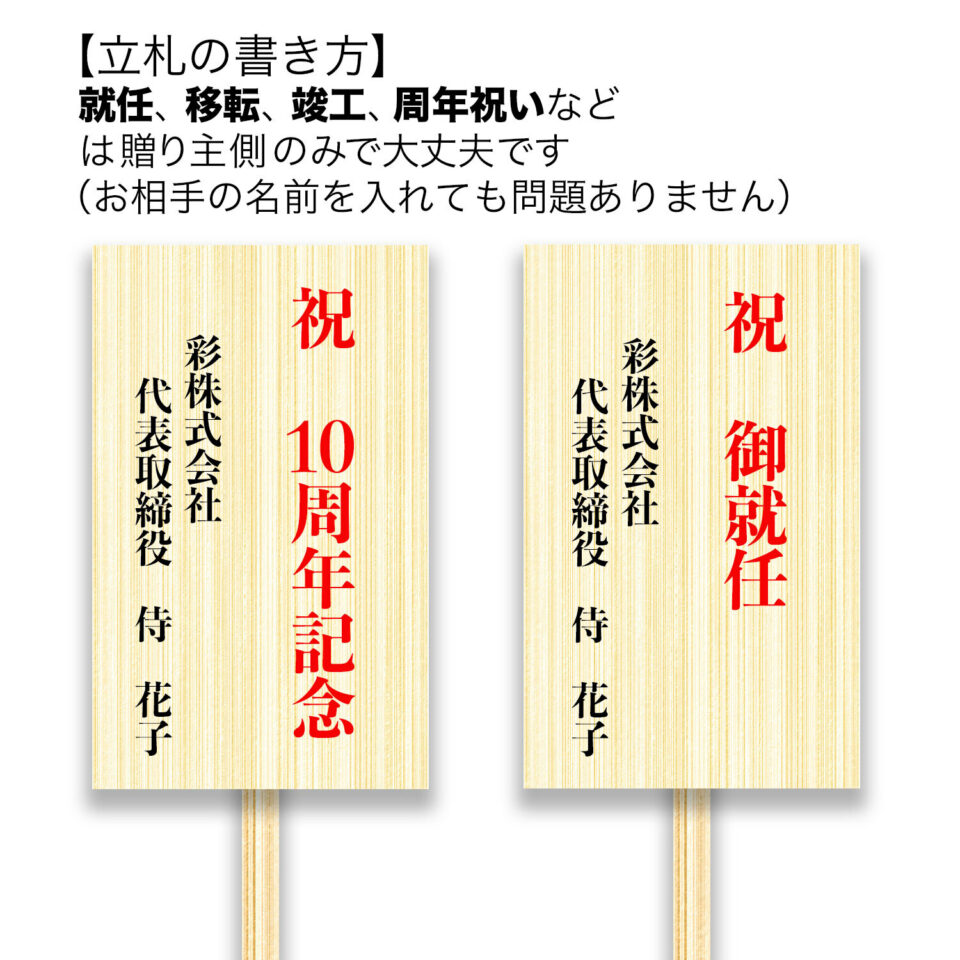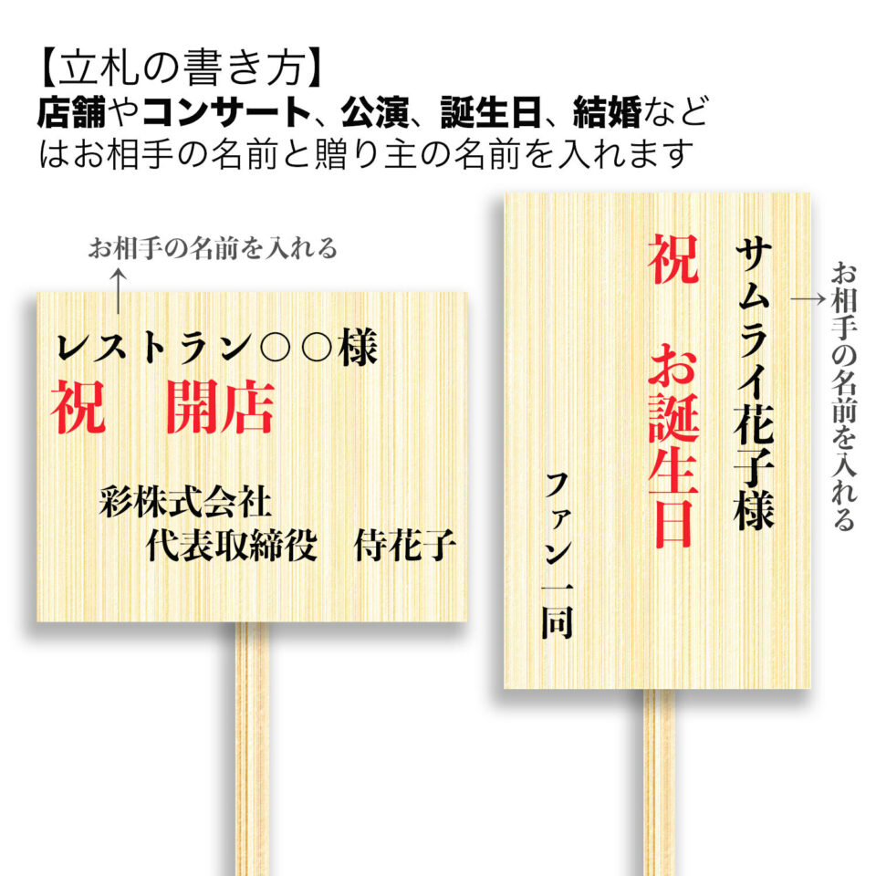 こちらの立て札は、逆にあえてお相手のお名前を入れます。送り先が開店祝いなどの店舗に贈る際などは店名を入れます。そうすることによって、宣伝効果にもつながります。