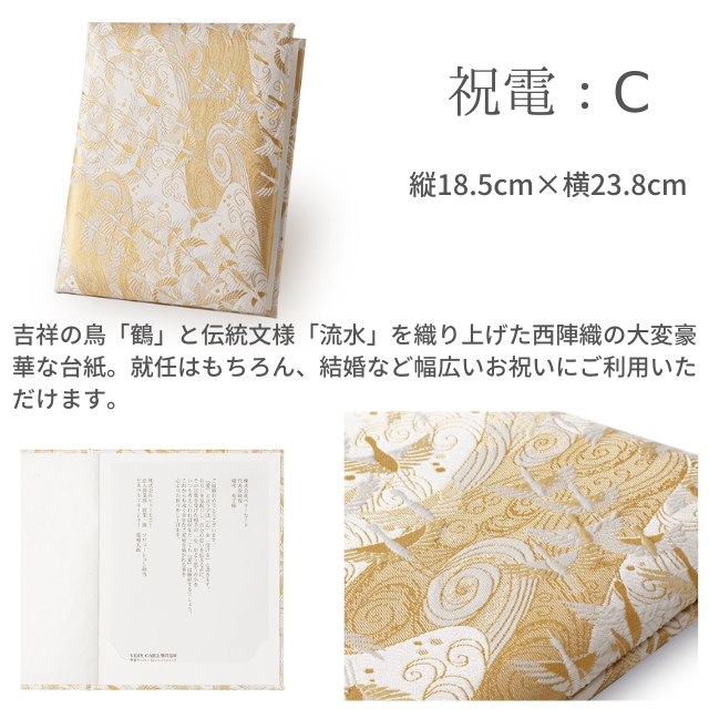 祝電(松コース)は華やかな祝電を3種類ご用意しております。こちらの写真は西陣織の大変豪華な台紙を使用しておりますので、ご結婚祝いはもちろん、法人間のお祝いにもふさわしい祝電です。