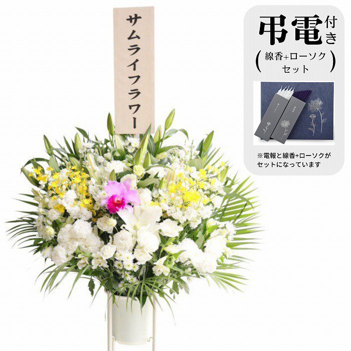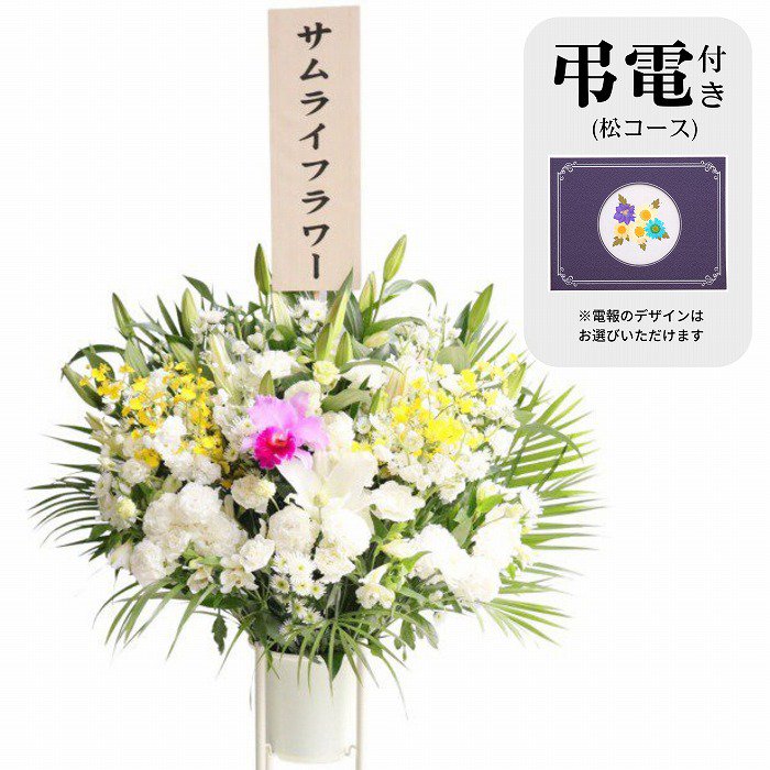 こちらは、弔電(松コース)とお供えスタンド花(和風)がセットになった大変便利でお得な商品です。