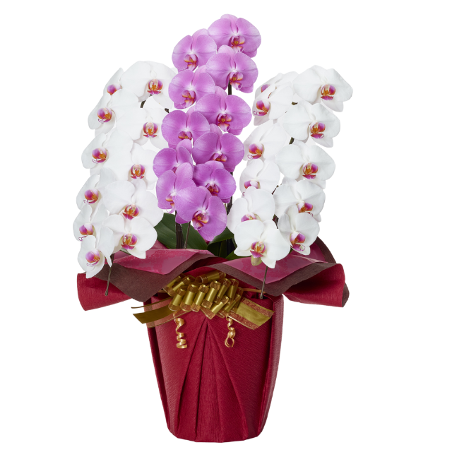 長寿祝いにおすすめ紅白胡蝶蘭3本立て。還暦お祝い・古希祝い等のお花に