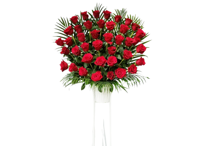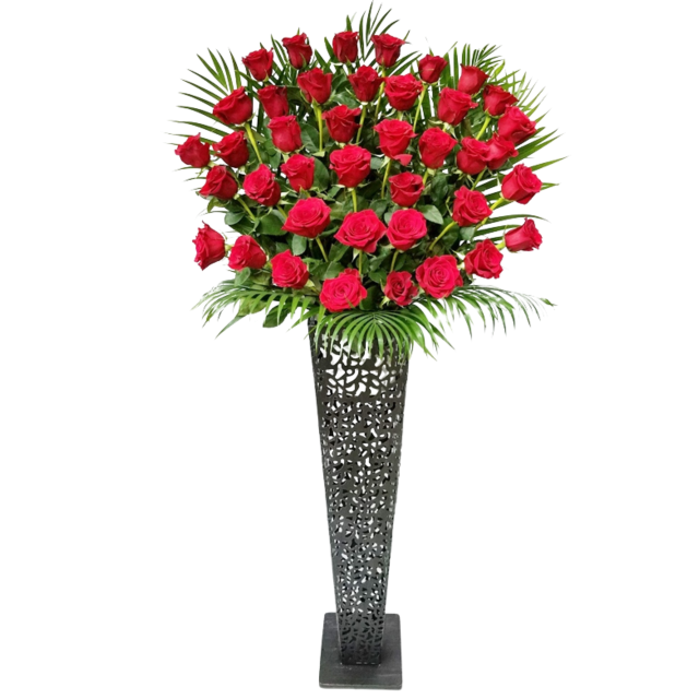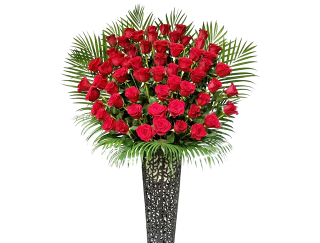 赤いバラのみで贅沢にお仕立てするスタンド花は開店祝いはもちろん、コンサートやパーティーといったたくさんのお花が集まる場所でも、華やかで注目を浴びることでしょう。