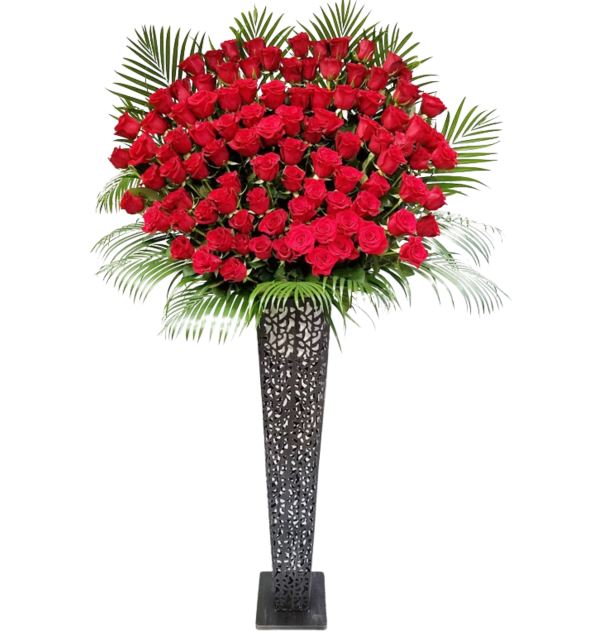 赤いバラのみで贅沢にお仕立てするスタンド花は開店祝いはもちろん、コンサートや公演祝いといったたくさんのお花が集まる場所でも、華やかで注目を浴びることでしょう。