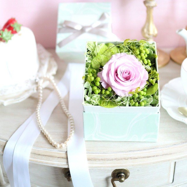 生花と見間違うような瑞々しいプリザーブドフラワーは枯れないお花で、宝石箱のような箱にお入れした状態でずっと飾っていただけます。
