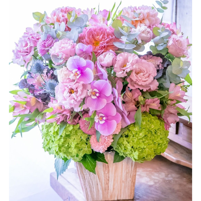 ピンク色のお花をメインに季節の花材をふんだんに取り入れて優しいイメージに仕立てた大変豪華なフラワーアレンジメントです。