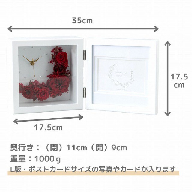 縦17.5cm、横幅35cmの花時計とフォトフレームがセットになったフラワーギフトです。