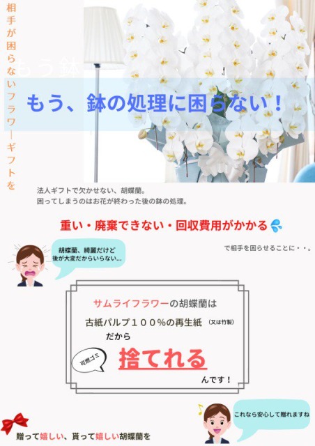 また、ラッピングも様々なお色から自由に選べ、胡蝶蘭の鉢は軽くて可燃ごみとして廃棄ができるエコな鉢を使用しているため、回収の手間がありませんのでお届け先で喜ばれます。