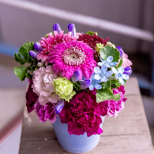 季節の花材でお仕立てするフラワーアレンジメント。巧みな色使いが得意なフラワーアーティストが仕立てるフラワーアレンジメントは華やかさと繊細さを併せ持ち見る人を幸せにします。