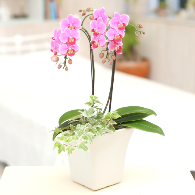 比較的安価にお買求めいただけるピンクのミニ胡蝶蘭はお手入れしやすく1か月から1か月半ほどお花を楽しむことができます。また、こちらのミニ胡蝶蘭は観葉植物を寄せている少し珍しいタイプです。