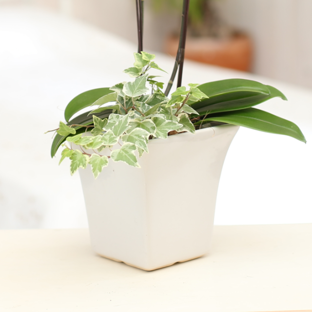 可愛らしいミニ胡蝶蘭に観葉植物を寄せた珍しい商品です。ミニ胡蝶蘭の愛らしさと観葉植物の爽やかさがマッチした贈り物にピッタリの商品です。