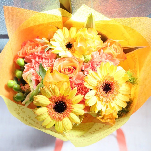 黄色やオレンジをメインに季節の花材でお仕立てした花束は、パッと明るくおめでたいシーンを彩ります。元気になれるビタミンカラーで様々なお祝いシーンでご利用いただけます。