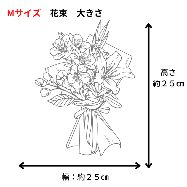 こちらは全体の大きさが約25cm、幅約25cmの花束です。お花がぎゅっと詰まっており豪華!