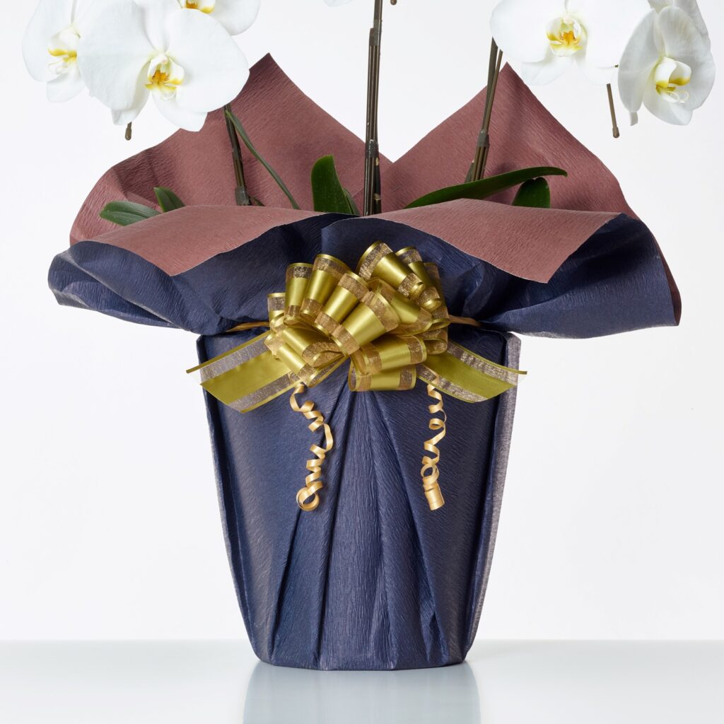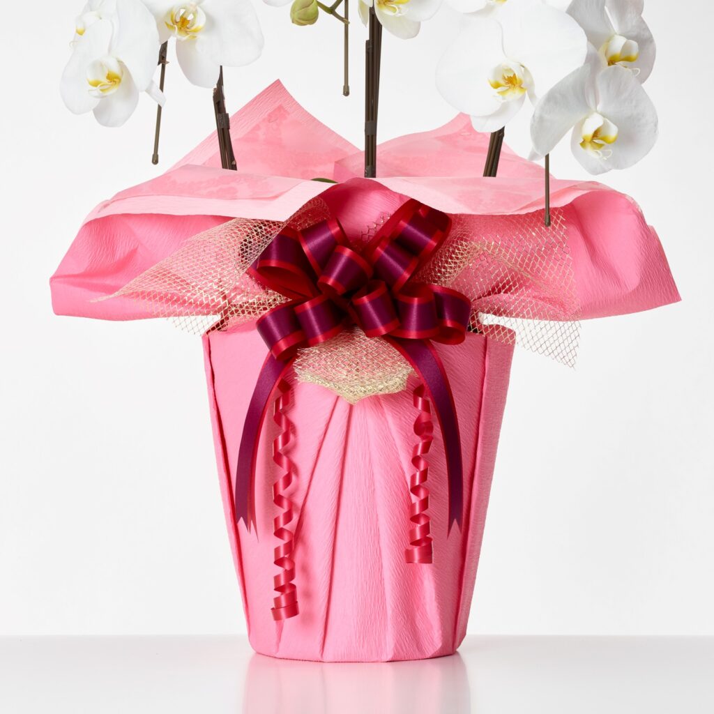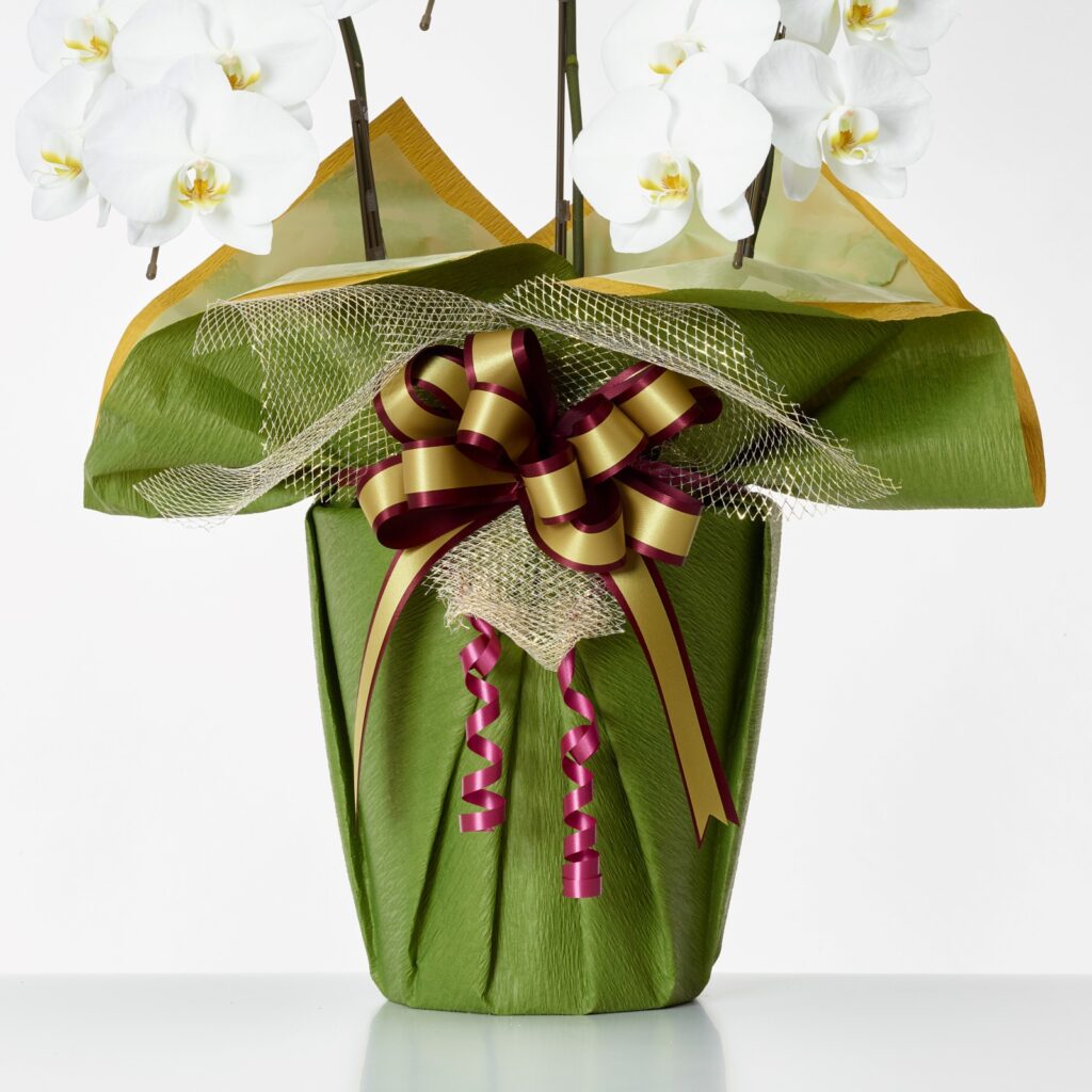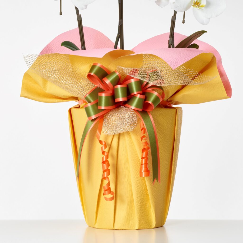 胡蝶蘭の鉢は、生産者からお届けするものは原則、古紙パルプ配合率100%再生紙を利用したものや、竹製でできた鉢等を使用しておりますので、お届け先にて困らず、お花が終わった後、容易に処分できるので大変喜ばれております。