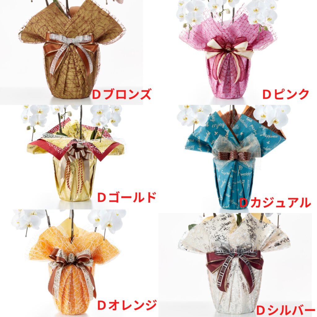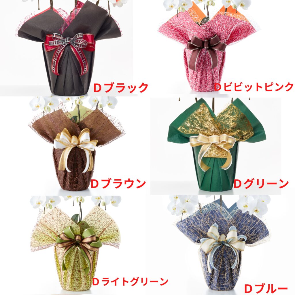 ラッピングはご用途に併せてお祝用と、お悔み用に分かれます。お祝用は明るめに、お悔み用はシックにお包み致します。お好みの色、お届けする事務所や店舗等の雰囲気や、コーポレートカラー、企業カラーなどイメージをそのままラッピングに反映することが可能です。