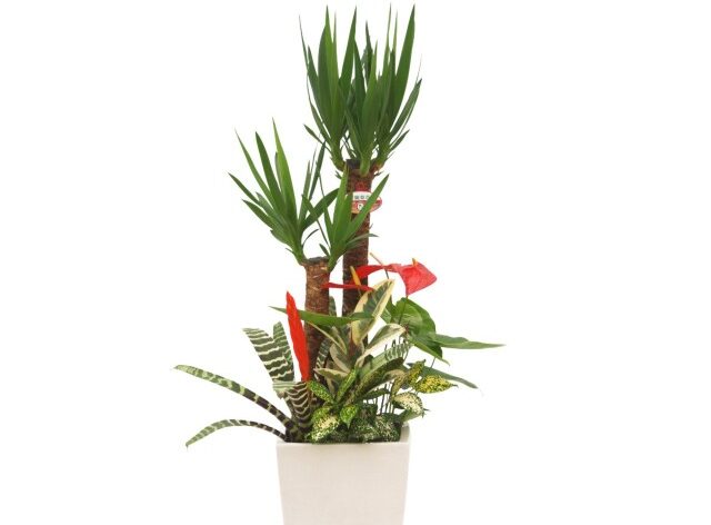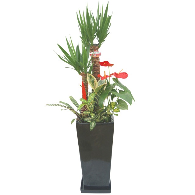 ぐんぐん上に伸びると縁起の良い青年の木におしゃれなアンスリューム等を寄せ植えした豪華な観葉植物。