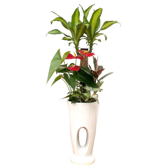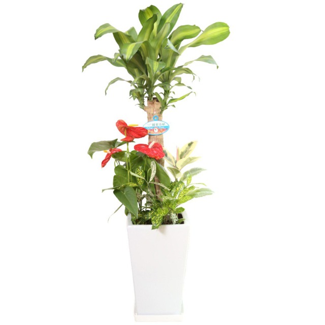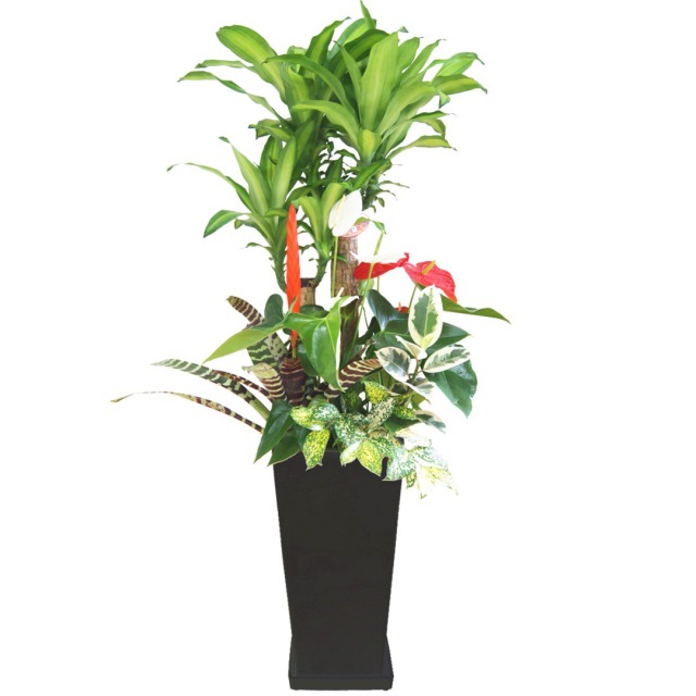 縁起の良い幸福の木におしゃれなアンスリューム等を寄せ植えした豪華な観葉植物。