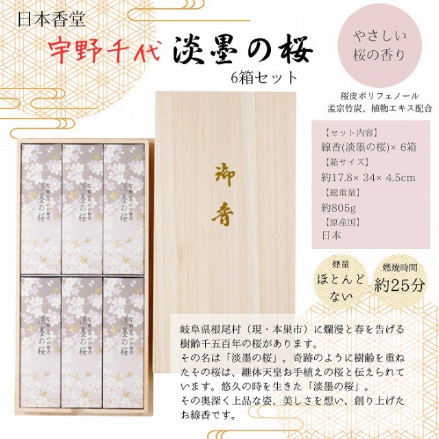 またこちらは「宇野千代 淡墨の桜」お線香6箱セットです。優しい桜の香りで煙も少ないためどなたでもご利用いただけます。