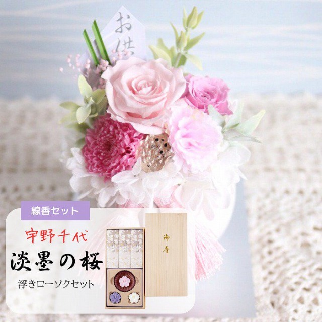 宇野千代のお線香&浮きローソクとお供えプリザーブドフラワーのセット