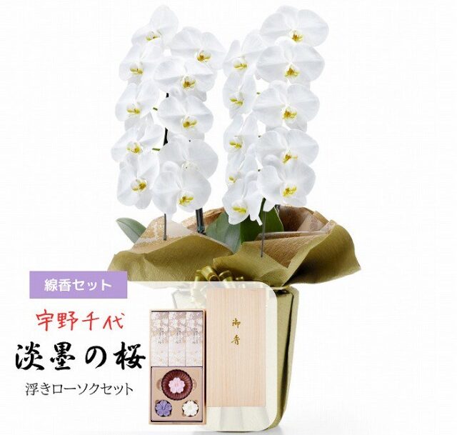 お供え用のミニ胡蝶蘭と「宇野千代のお線香」がセットになったお得な商品です。