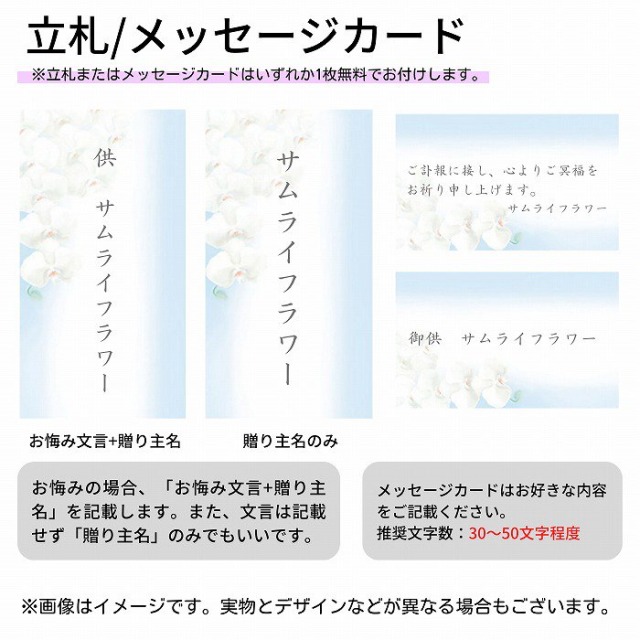 お供え用胡蝶蘭をご注文いただきましたら無料の立札もしくはメッセージカードをお付けします。