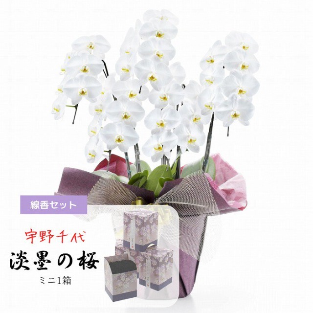 お供え用の大輪胡蝶蘭と「宇野千代のお線香」がセットになったお得な商品です。