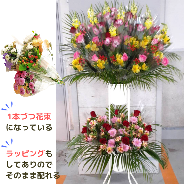 こちらのスタンド花は1本ずつ花束になっており、ラッピングもされているので分けることが出来て便利です。