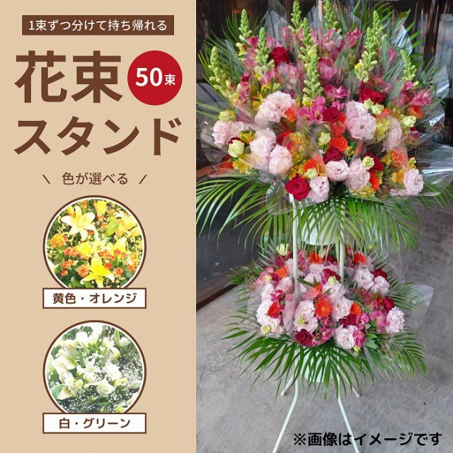 - 50本の花束で仕立てた分けられるスタンド花は持ち帰ることが出来る