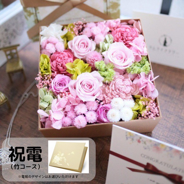 電報(竹コース)とプリザーブドフラワー(ピンク)Sサイズのここがおすすめ!