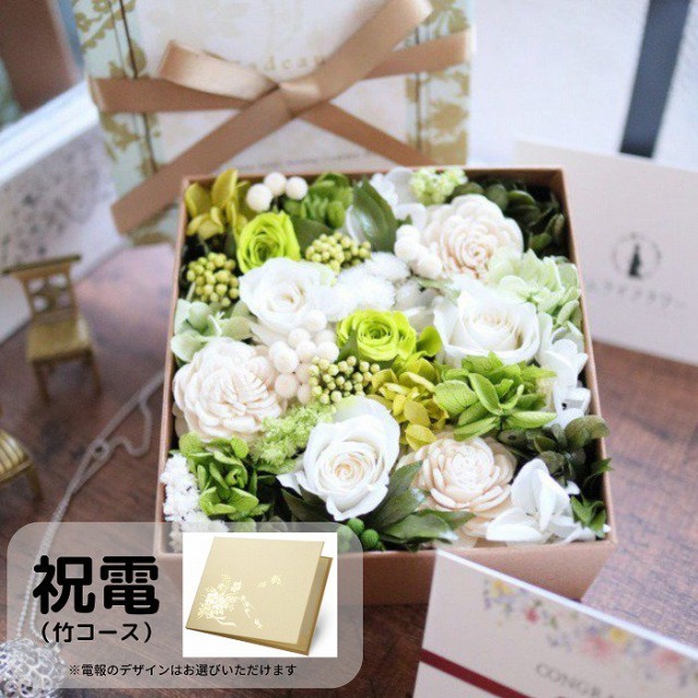 電報(竹コース)とプリザーブドフラワー(ホワイト&グリーン)Sサイズのここがおすすめ!