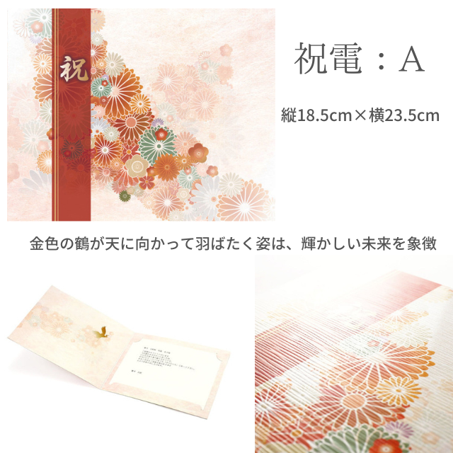 またこちらは3種類から選べる祝電(梅コース)がセットになっておりますのでお祝いシーンに合わせてお好きな電報をお選びいただけます。