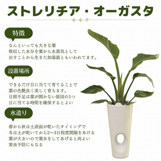 南国を思わせる大きな葉が特徴的なストレリチア・オーガスタは、その葉は吸収した水分を葉から水蒸気として出すため加湿器のような役割をしてくれる観葉植物です。