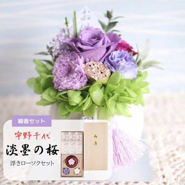 ご宇野千代のお線香とプリザーブドフラワー(紫系)のセット