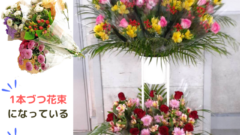 1本1本をラッピングした状態の花束をまとめてスタンド花にしているため、花束としても