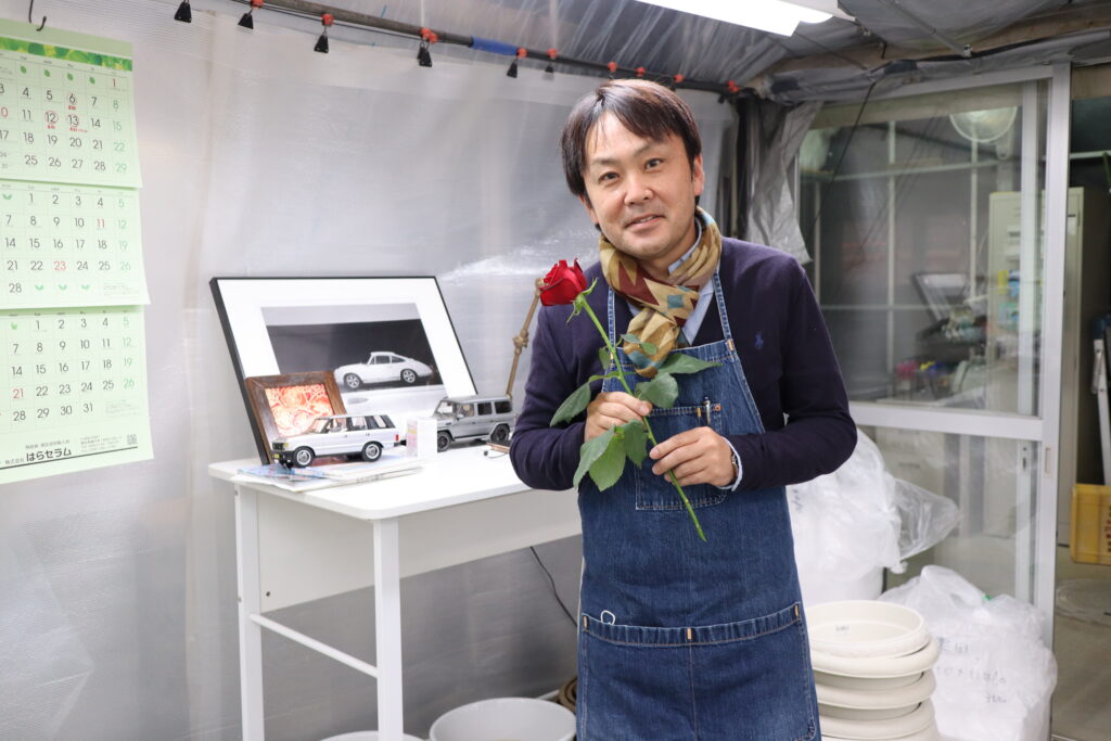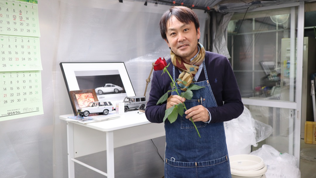 バラを持ってますが生産しているのは、あの紛れもない美しい唯一無二の凛とした最高峰の胡蝶蘭です。栗田曰く、「生花を毎日飾っている。生花はとってもいい」と。
