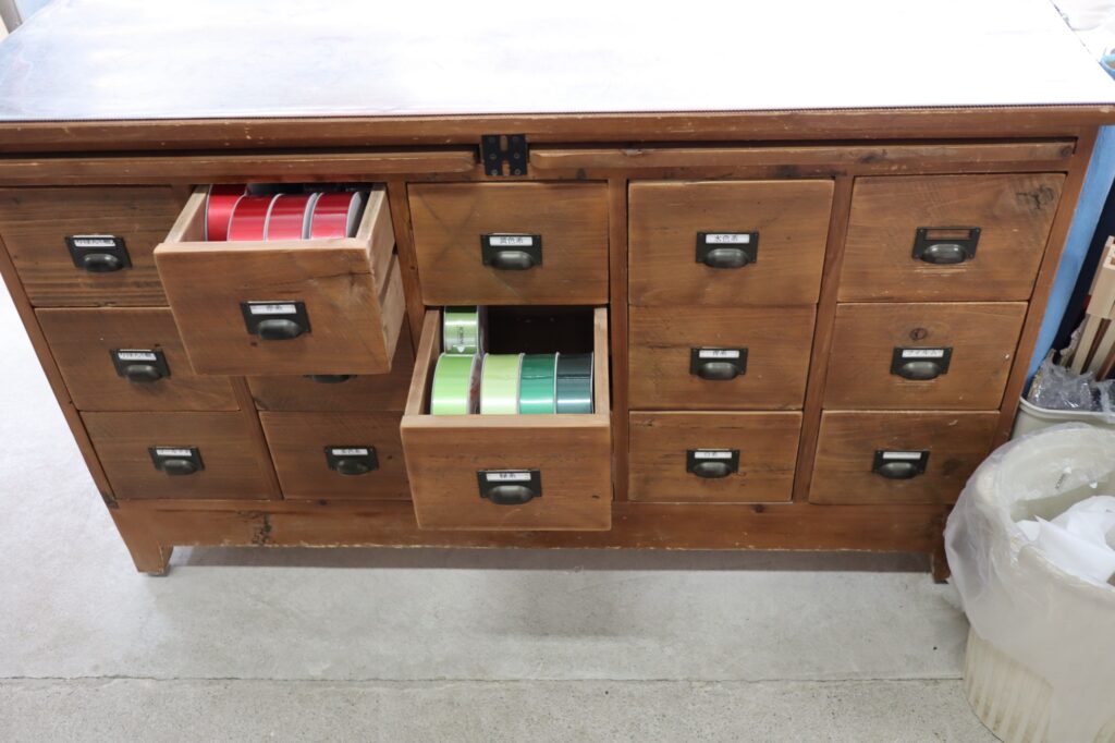 お花を結ぶリボンも、アンテイーク調の引き出しに同系色同志きちんと整理して入れています。家の中のようですがこれが外にあるものです。