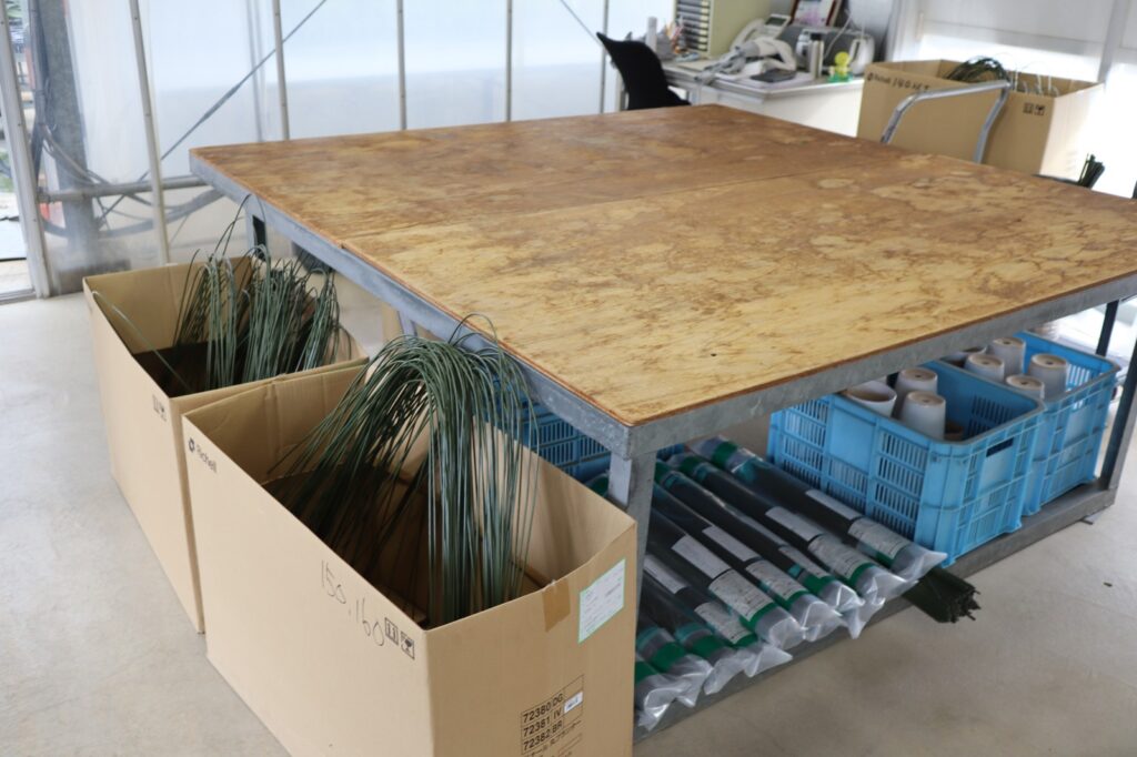 「温室内はとにかくきれいに!ベンチ下まで掃除をして常に清潔に保ち、病害虫の発生や設備不良の早期発見をできるようにしています。花も資材も整理整頓を心がけることで在庫状況を把握しやすくしお客様のご要望に対応できるようにしています。