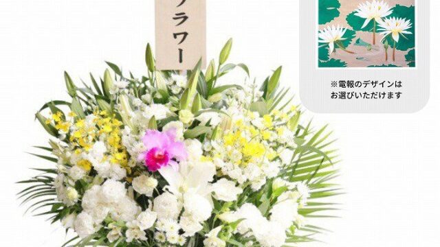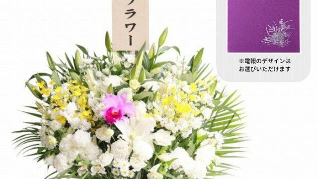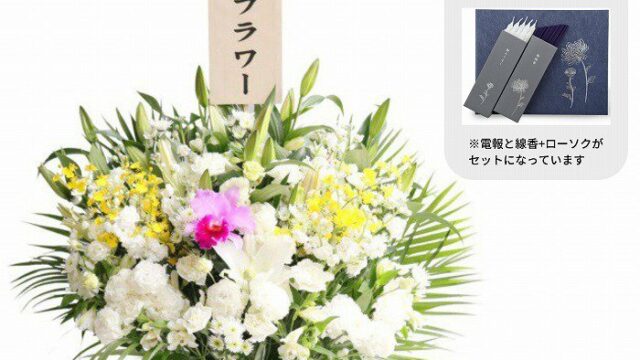 弔電(お悔やみ電報)とお線香がセットになったお供え花訃報の連絡は予期せず突然やってきます。ご遺族様へ一刻も早くお悔やみの気持ちをお伝えするために、お供え花のお届けは欠かせませんよね。こちらは、弔電(線香・ローソクセット)とお供えスタンド花(...