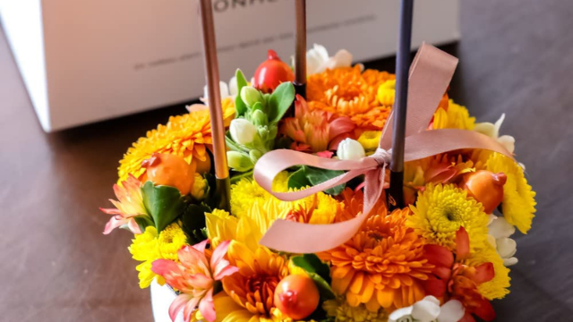 誕生日プレゼントに人気のフラワーケーキ(生花)オレンジ系/受賞歴多数のフローリストからお届け