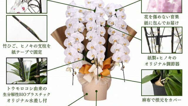 自然素材由来の質感が胡蝶蘭を引き立てるとともに、不燃ごみゼロなので贈られた方が処分に困ることがありません。